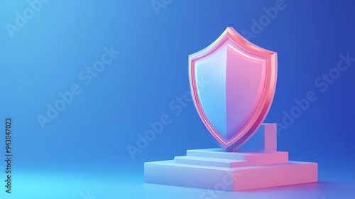 Digital shield on pedestal symbolizing cybersecurity, protection, and safety in a blue gradient background. Futuristic digital security concept.