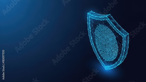 Digital shield with fingerprint scan represents cybersecurity and identity protection