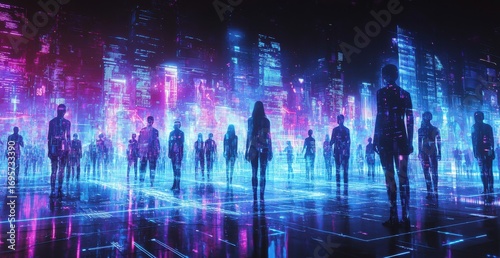 Digital silhouettes of futuristic figures in vibrant holographic neon cityscape