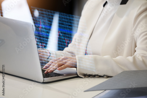 digital technology, Business woman using computer to trade charts to find buy and sell points for her port.