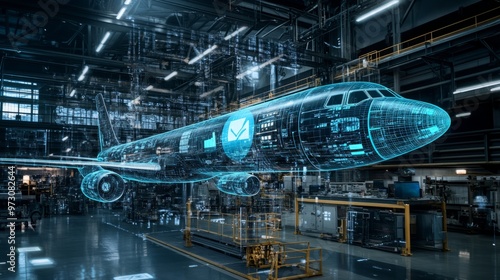 Digital twin of an industrial air with digital overlay showing data and collaboration icons, highlighting the integration between blue rocket on one side