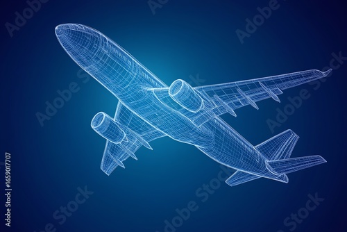 Digital Wireframe Model of Commercial Passenger Airplane in Blue Background