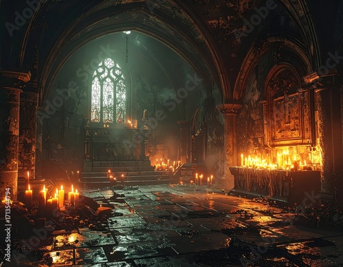 Dimly Lit Gothic Church Interior with Candles and Mysterious Atmosphere
