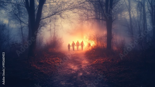 Dimly lit, haunted forest path with ghostly figures and fog, creating an atmospheric Halloween scene for scary stories