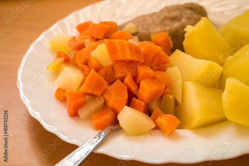 Dinner meal, braised carrot, boiled potatoes and meat