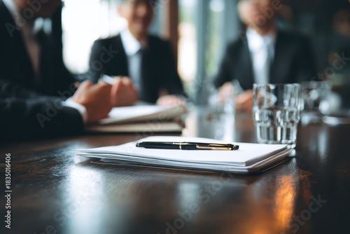 Diplomats engage in crucial discussions at a negotiation meeting around a wooden table in a modern conference room during daylight hours