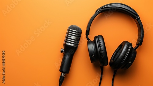 Directly above view of headphones and recording microphone on vibrant orange background, perfect for podcasting concepts, audio recording, broadcasting, and media production themes
