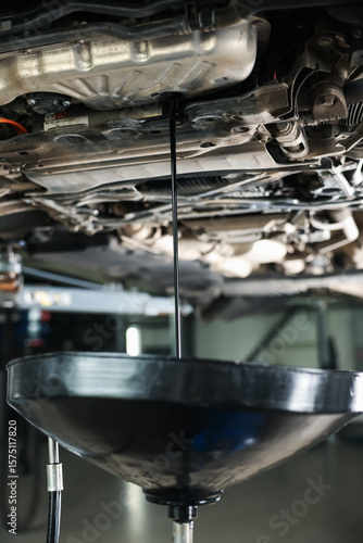 Dirty old motor oil dripping from car engine into container in workshop, closeup