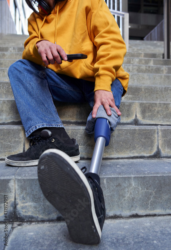 Disabled man with leg prosthesis holding smart phone while sitting on steps