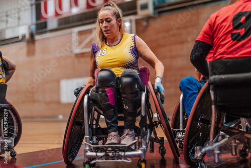 Disabled rugby athletes sitting on wheelchair and playing in sports court