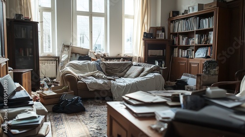 Disorganized living room following a burglary, with personal belongings tossed carelessly, furniture displaced, and a sofa in chaos, sense of intrusion palpable.