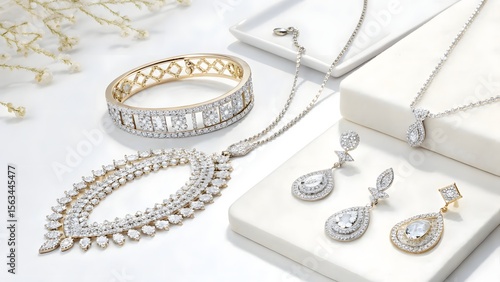 Display of diamond jewelry including a bracelet necklaces and earrings on a white surface