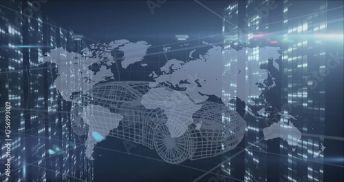 Displaying 3D wireframe car model in data grid, with data columns showing world map overlay