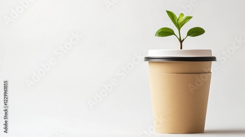 Disposable coffee cup with growing green plant, sustainable eco-friendly concept background with copy space