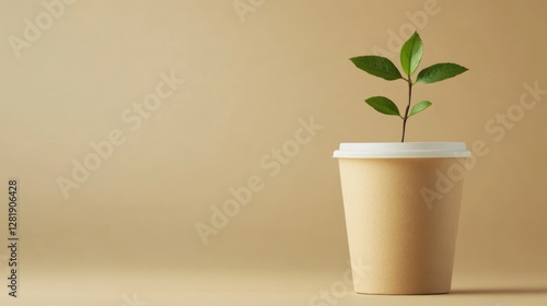 Disposable coffee cup with growing green plant, sustainable eco-friendly concept background with copy space