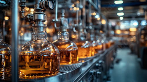 Distillation process in a modern production facility showcasing amber liquid in glass bottles