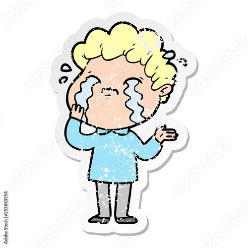 distressed sticker of a cartoon man crying