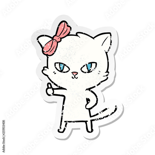 distressed sticker of a cute cartoon cat giving thumbs up symbol