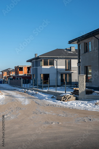 District of detached houses under construction. Several houses at different stages of finishing.