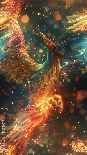 Dive into a futuristic world where nanotechnology intertwines with mythical creatures in a panoramic view Illustrate a mythical phoenix surrounded by microscopic nanostructures