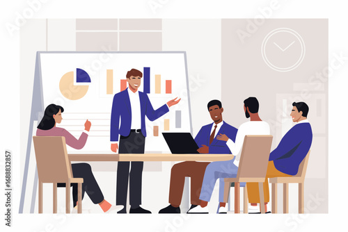 Diverse business team in a meeting room presenting financial data and charts on a whiteboard