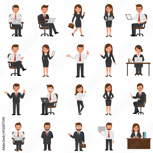 Diverse Cartoon Business People Standing Sitting Holding Objects and Posing.
