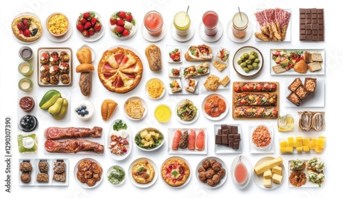 Diverse gourmet food selection on white background.
