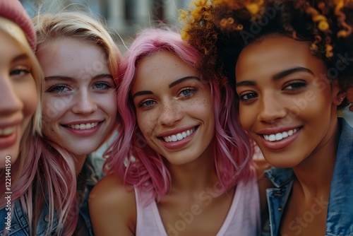 Diverse group of cheerful young women with colorful dyed hair including pink and natural curls smiling together in casual setting, perfect for beauty and friendship concepts.