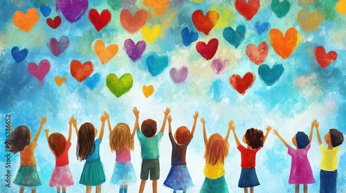 diverse group of children with raised arms reaching towards sky filled with colorful painted hearts uplifting unitythemed illustration