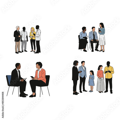 Diverse group of people in various meeting and conversation setups