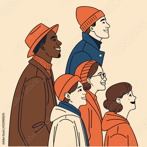 Diverse Group of Smiling People in Winter Outfits