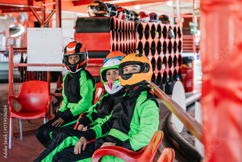 Diverse group of young friends wearing safety helmets and racing suits, waiting before go karting on a track