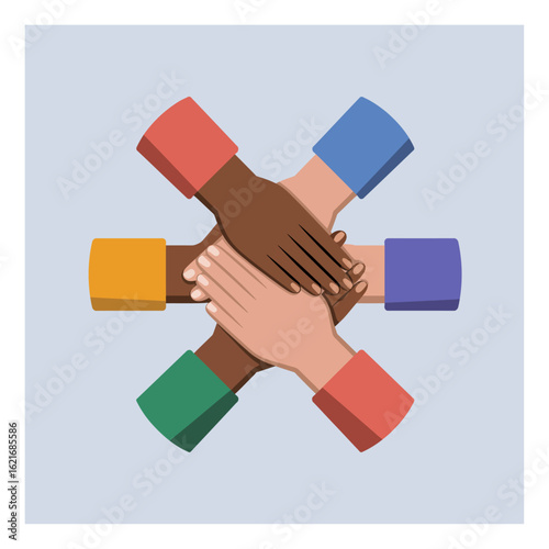 Diverse hands of different skin tones are stacked together in a symbolic gesture of unity, collaboration, and teamwork among people.