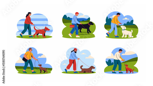 Diverse people walking their dogs in various outdoor settings showcasing the bond between humans and animals