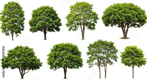 Diverse photorealistic deciduous trees with lush green canopies, detailed bark, varied trunks, and unique branching, isolated on a seamless transparent studio background with soft lighting and no