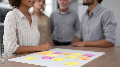 Diverse professionals collaborate on a strategy using colorful sticky notes during a business meeting in a modern office