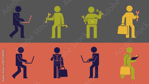 Diverse professions and trades represented by stick figures with tools and laptops