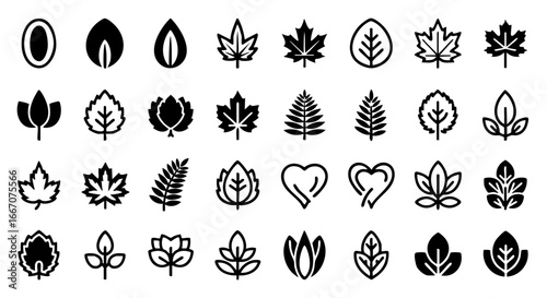 Diverse set of black leaf icons and natural symbols. Simple vector plant pictograms for eco-friendly design projects