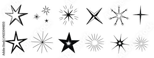 Diverse starbursts and star shapes drawn in black ink on white stars drawing