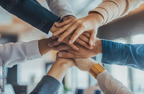Diverse team stacking hands, unity.