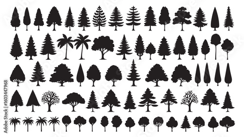 Diverse Tree Silhouette Collection A Variety of Shapes and Sizes Showcasing Forest and Landscape Design Elements for Creative Projects
