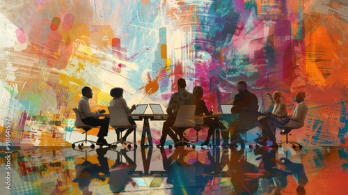 Diverse workforce using digital tools for management strategy discussions, set against a dynamic mixed media backdrop
