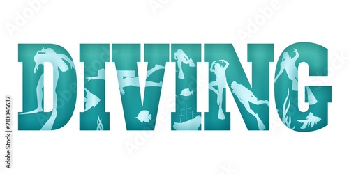 Diving word with silhouettes of diver. The concept of sport diving.