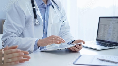 Doctor and a patient. The physician, wearing a white medical coat over a blue shirt, is using tablet computer during a consultation in the clinic. Medicine and science