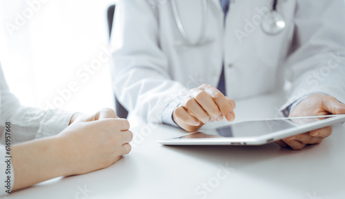Doctor and patient sitting near each other at the desk in clinic. The focus is on female physician's hands pointing into tablet computer touchpad, close up. Medicine concept