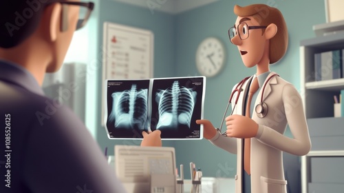 Doctor Explaining X-ray Results to Patient in a Modern Medical Office Setting with Illustrative Charts and Clock in Background