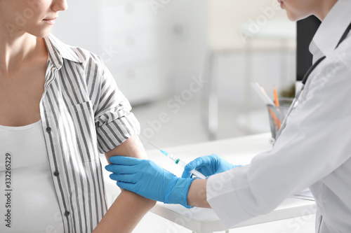 Doctor giving injection to pregnant woman in hospital, closeup. Vaccination concept