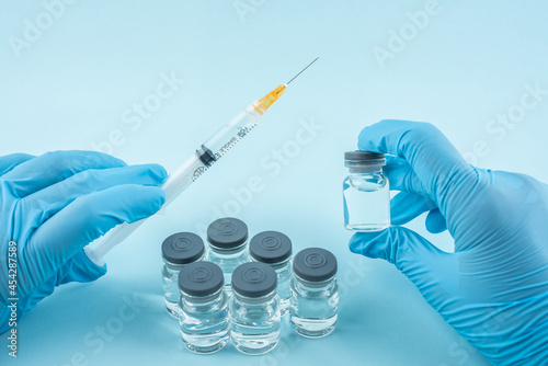 Doctor holding vaccine medicament and syringe in hand