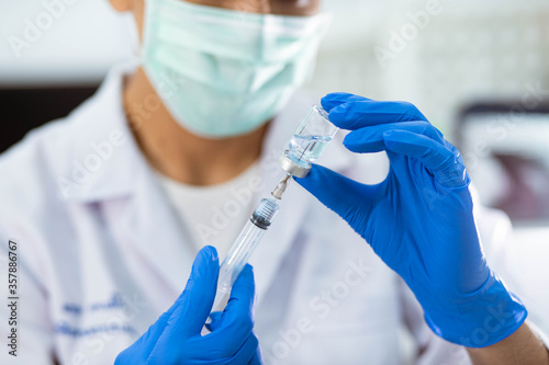 Doctor in blue glove filling syringe with vaccine