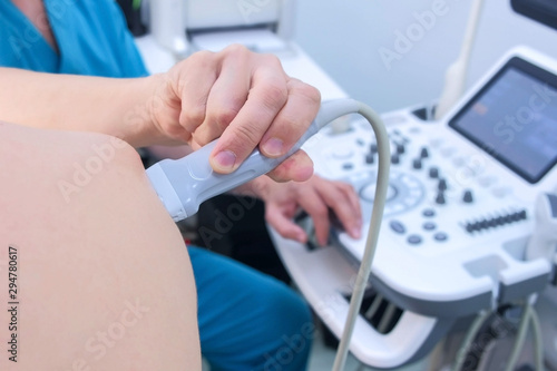 Doctor makes ultrasound of shoulder joint to man using ultrasound scanner in clinic, closeup. He runs ultrasound sensor over man's arm, working on scanner panel and looking at screen.